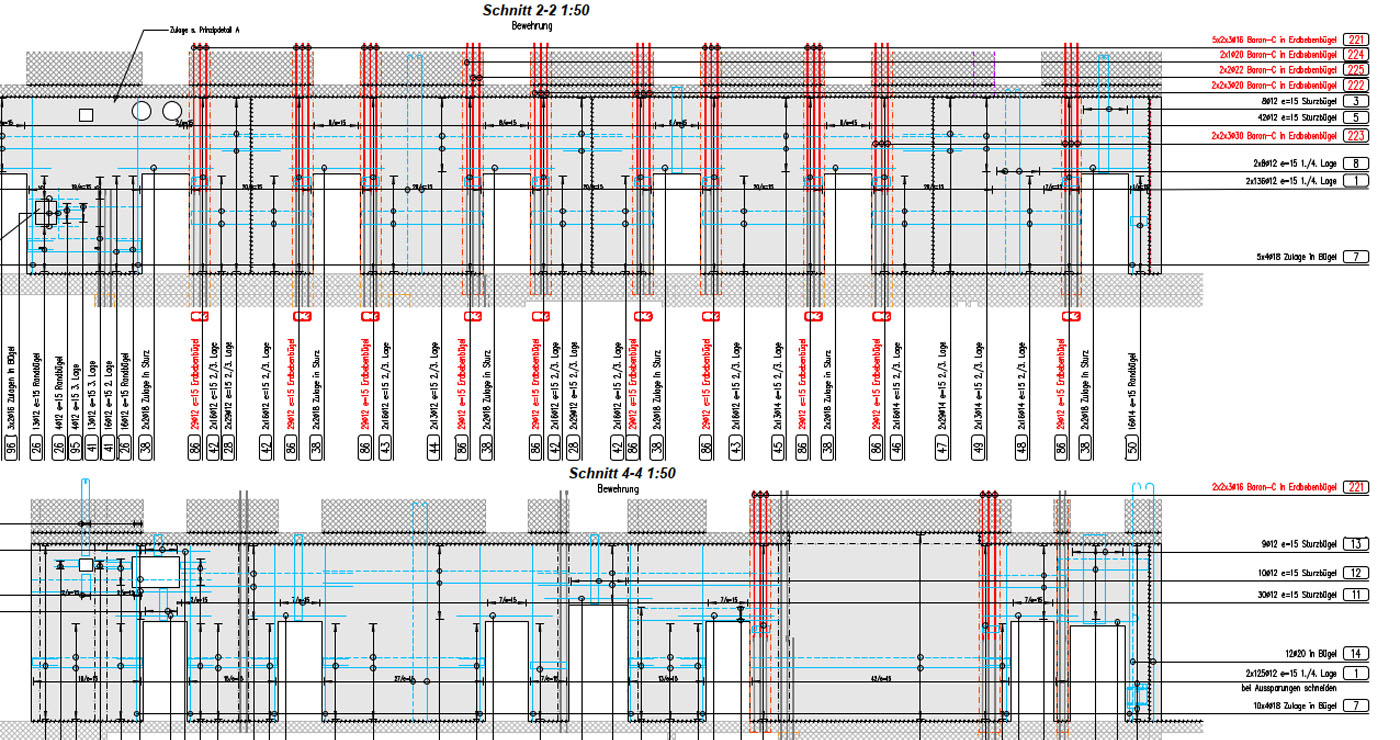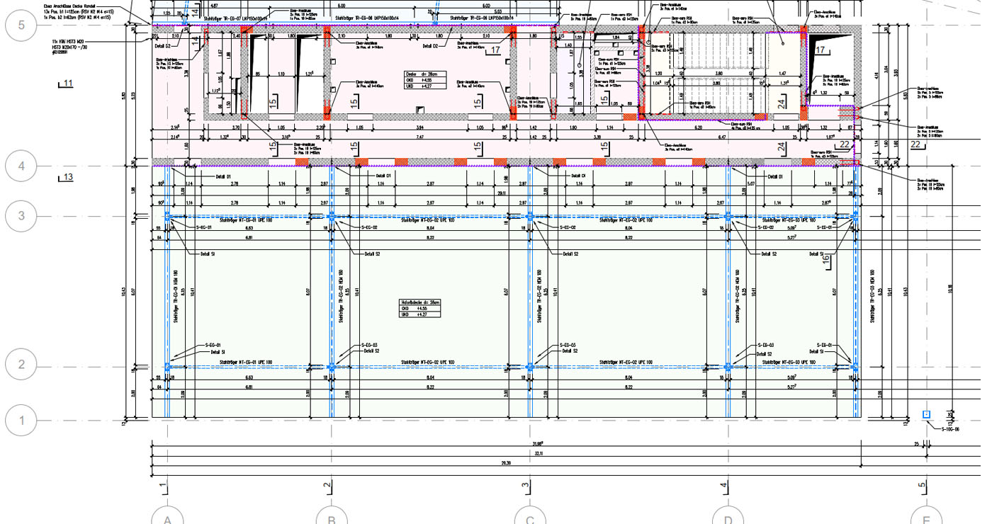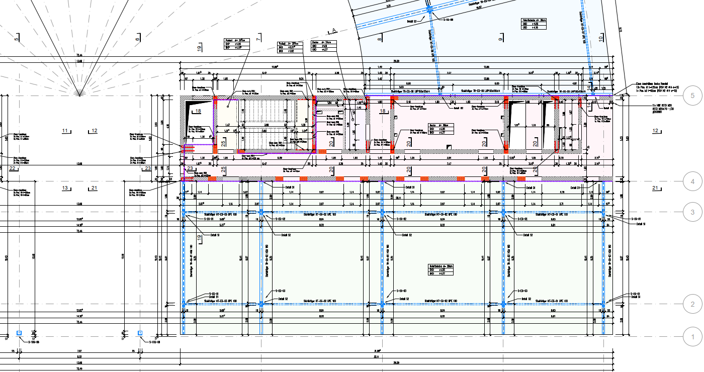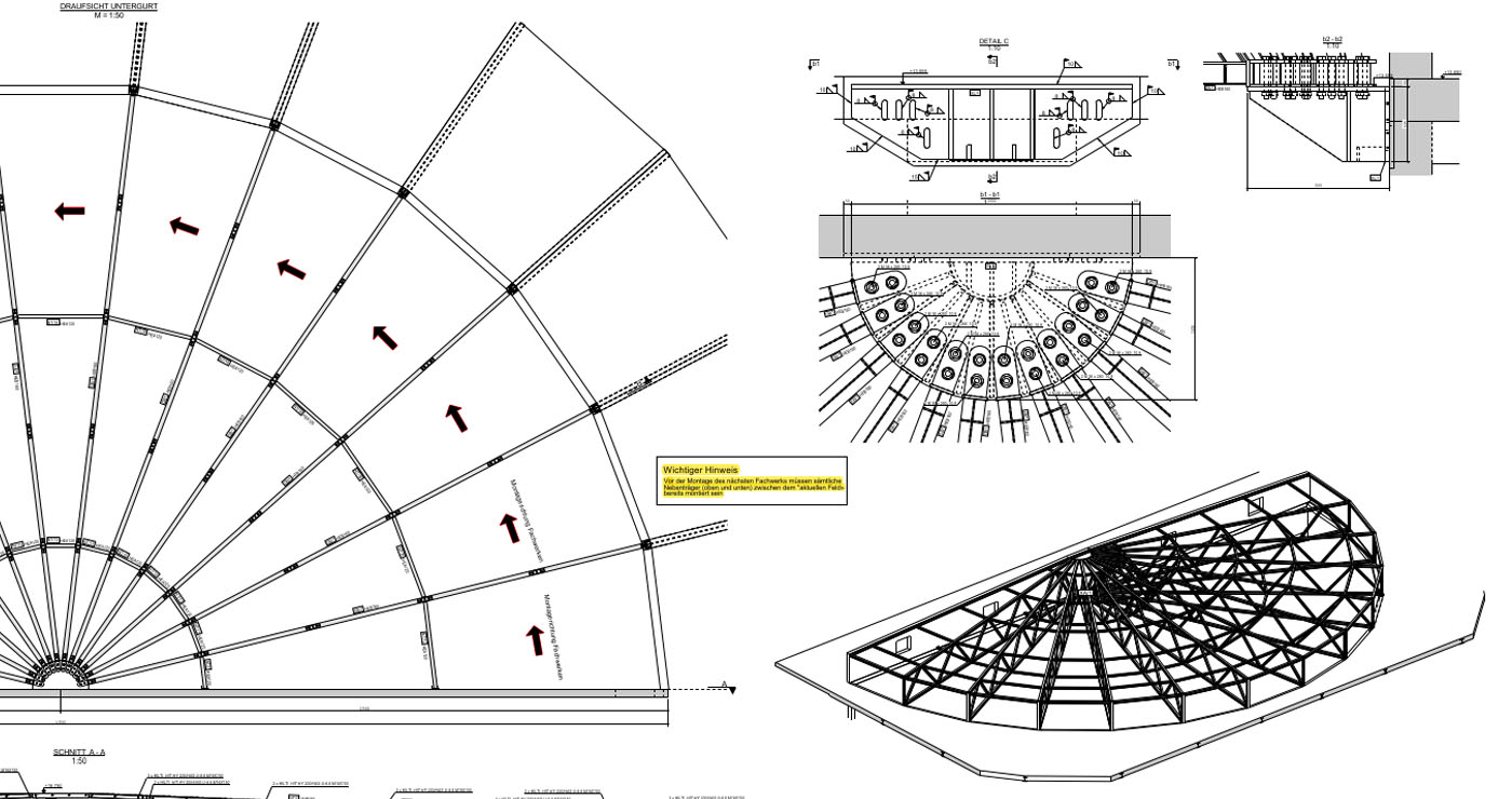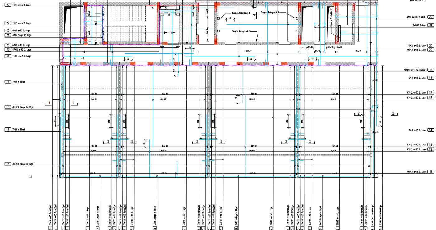 Für ein Bürogebäude wurden von uns die Schalungspläne, Bewehrungspläne sowie die Stahlbaupläne fachgerecht ausgearbeitet. Zudem erfolgte die statische Berechnung der Dachkonstruktion, einem räumlich ausgebildeten Fachwerksystem, einschliesslich der Erstellung präziser Werkstatt- und Montagepläne.